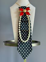 A charming blend of vintage whimsy and Parisian flair, Parisian Playdate turns timeless polka dots into pure sophistication with a dash of flirt. The black silk tie is sprinkled with soft blush dots, setting the stage for its show-stopping embellishments — a glossy crimson bow trimmed in gold and a string of luminous pearls cascading down the center. It’s playful yet poised, like a wink from Audrey Hepburn across a café table.