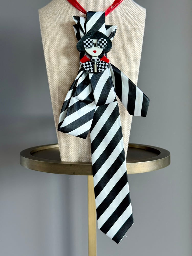 Bold black-and-white stripes set the stage for this whimsical UpTie, crowned by a stylish enamel lady brooch complete with chic bobbed hair, checkered glasses, and a cheeky red pout. The diagonal tie lines create movement, while the figure adds personality and charm—like a fashion muse straight off the streets of Paris. Parisian Pop is equal parts art, accessory, and conversation starter, perfect for those who love to wear their style with a wink and a smile.