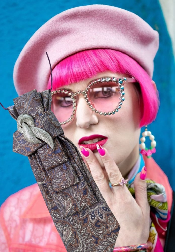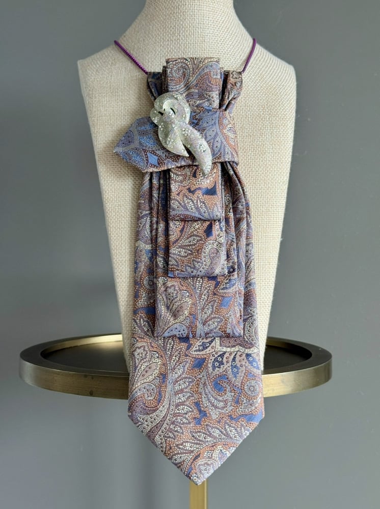 This UpTie is all about quiet luxury with a whisper of sparkle. The muted plum and slate paisley pattern creates a soft, elegant backdrop, while the shimmering silver swirl brooch adds a touch of glamour without shouting. It’s graceful, polished, and subtly stunning.