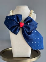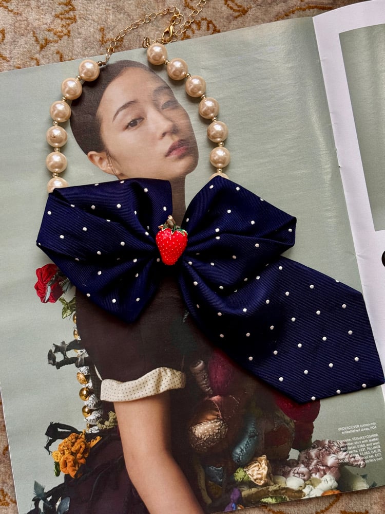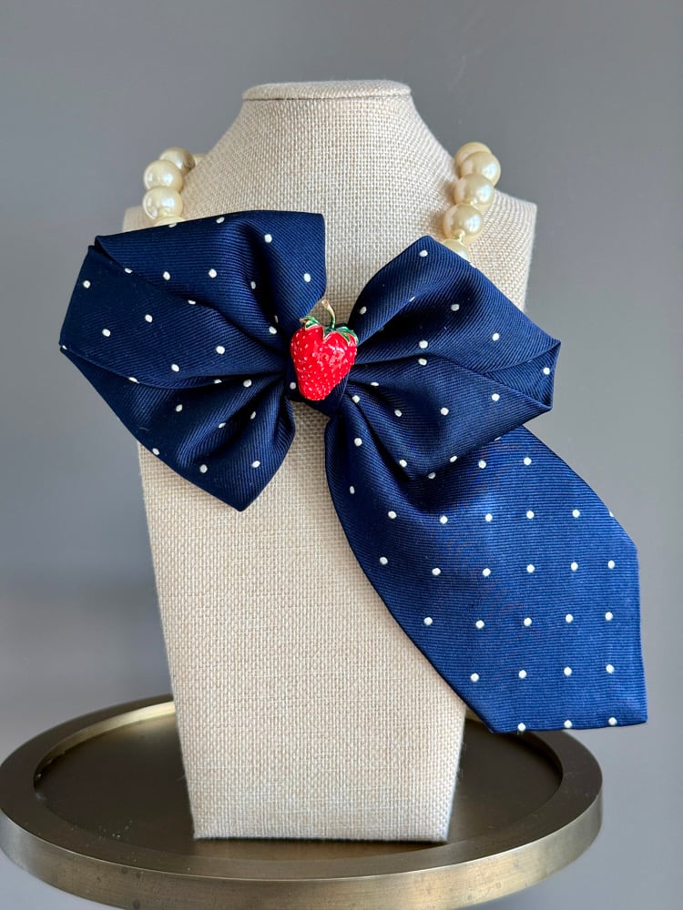 This one-of-a-kind UpTie is crafted from a classic navy silk tie with delicate white polka dots, sculpted into a bold, oversized bow that feels both timeless and playful.