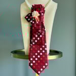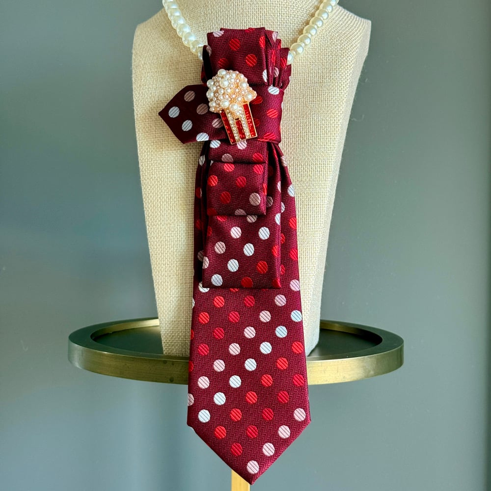 A playful twist on classic elegance. This burgundy UpTie dances with multicolored polka dots in soft pink, silver, and bold red. Its layered folds are topped with a vintage pearl cluster popcorn brooch, adding just the right touch of sophistication and sparkle. Finished with a pearl strand neckline, it’s the perfect mix of fun and refined—ideal for brunches, soirées, or anytime you want your look to pop with personality. Movie Night?