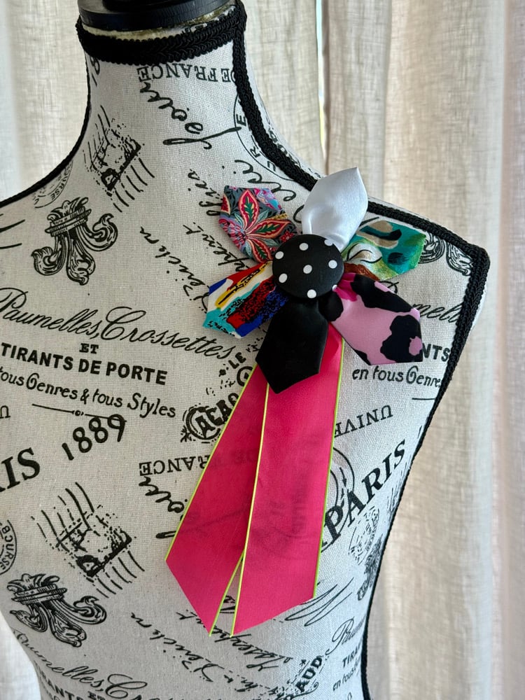 A vibrant celebration of color, contrast, and creativity, Pop Art Parade is a maximalist dream brought to life. This one-of-a-kind UpTie brooch bursts with personality—layered petals of mixed prints (florals, abstracts, animal-inspired spots) radiate from a bold black-and-white polka dot center.