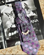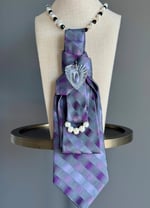 This UpTie is moody, mysterious, and dripping in elegance. Made from a silky tie in layered shades of eggplant, plum, and lavender, the pattern plays with dimensional stripes in a mesmerizing ombré effect. The folded silhouette is bold yet refined, accentuated by a gleaming silver heart brooch with a sacred, almost talismanic design. Below, a delicate arc of luminous pearls creates contrast with soft femininity, while the neck is finished with a beaded strand of black, crystal, and pearl beads — balancing light and shadow like a fashion-forward gothic romance.