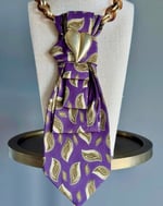 This UpTie is a bold fusion of vintage soul and modern edge. Featuring a rich plum base patterned with golden paisley leaves, the tie’s earthy tones and mid-century motif give it a warm, retro vibe. The folded construction adds depth and refinement, while the oversized gold puffed heart centerpiece steals the spotlight with fierce femininity. It’s finished with a chunky tortoiseshell and gold chain that adds an extra punch of power and polish.
