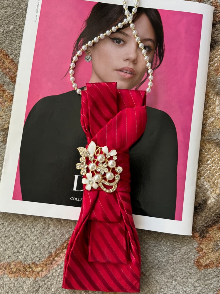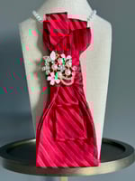 A radiant UpTie crafted from upcycled silk in a rich raspberry hue with subtle diagonal striping that catches the light beautifully. Sculpted into graceful folds and adorned with a pearl-and-crystal floral brooch, this one-of-a-kind piece blends vintage romance with polished sophistication.