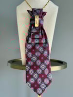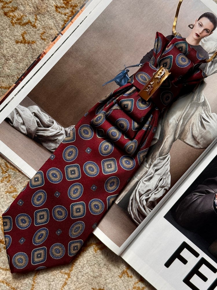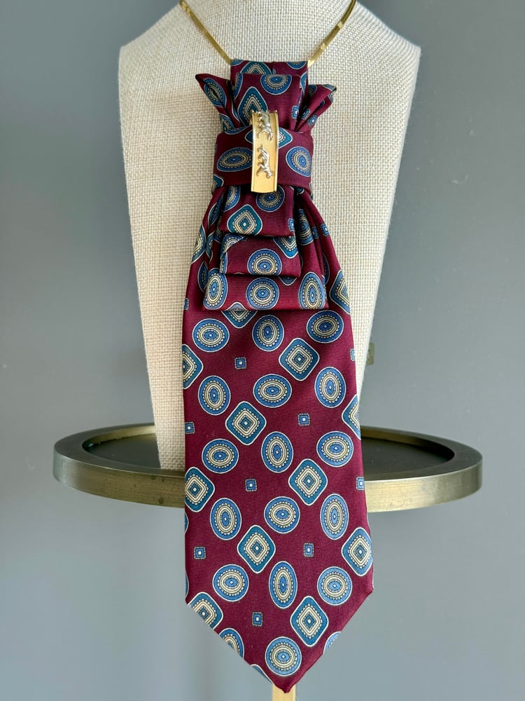 Regal Renaissance is crafted from a deep burgundy silk tie adorned with repeating geometric medallions in navy, gold, and soft teal — a pattern that feels both vintage and aristocratic. The color palette evokes old-world libraries, mahogany wood, and candlelit halls.