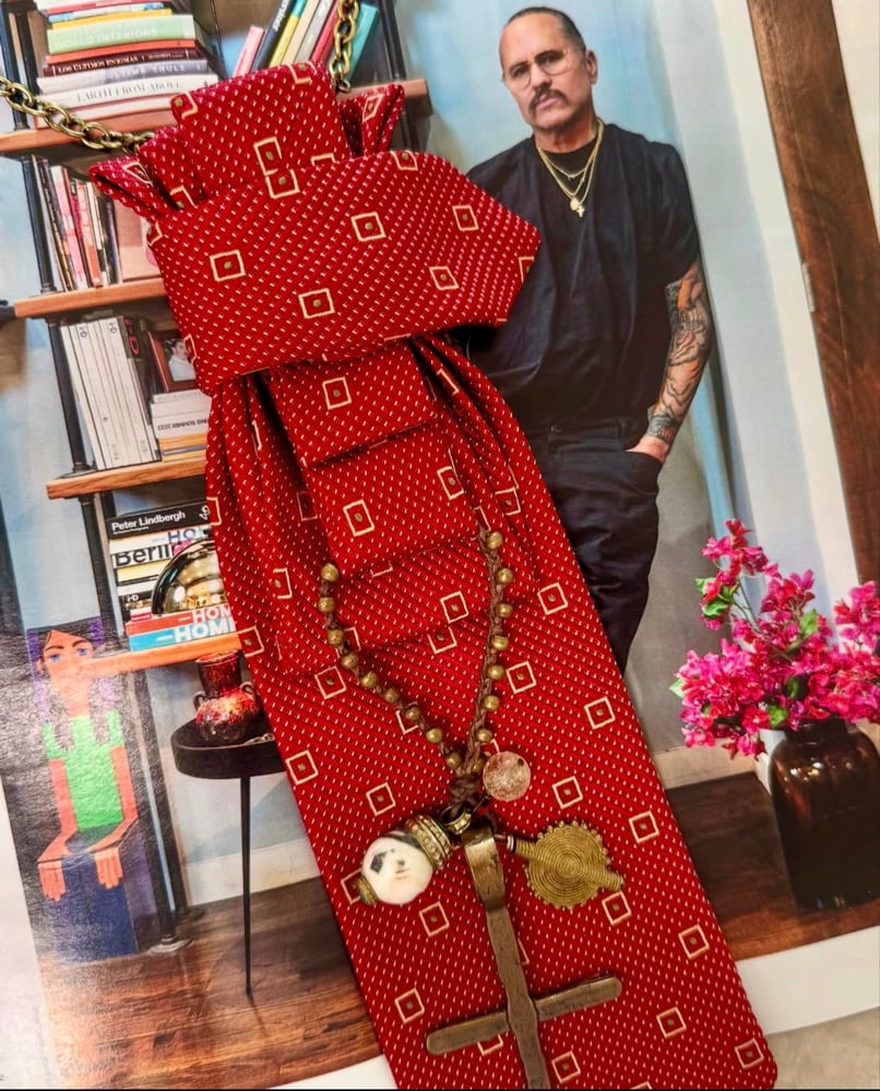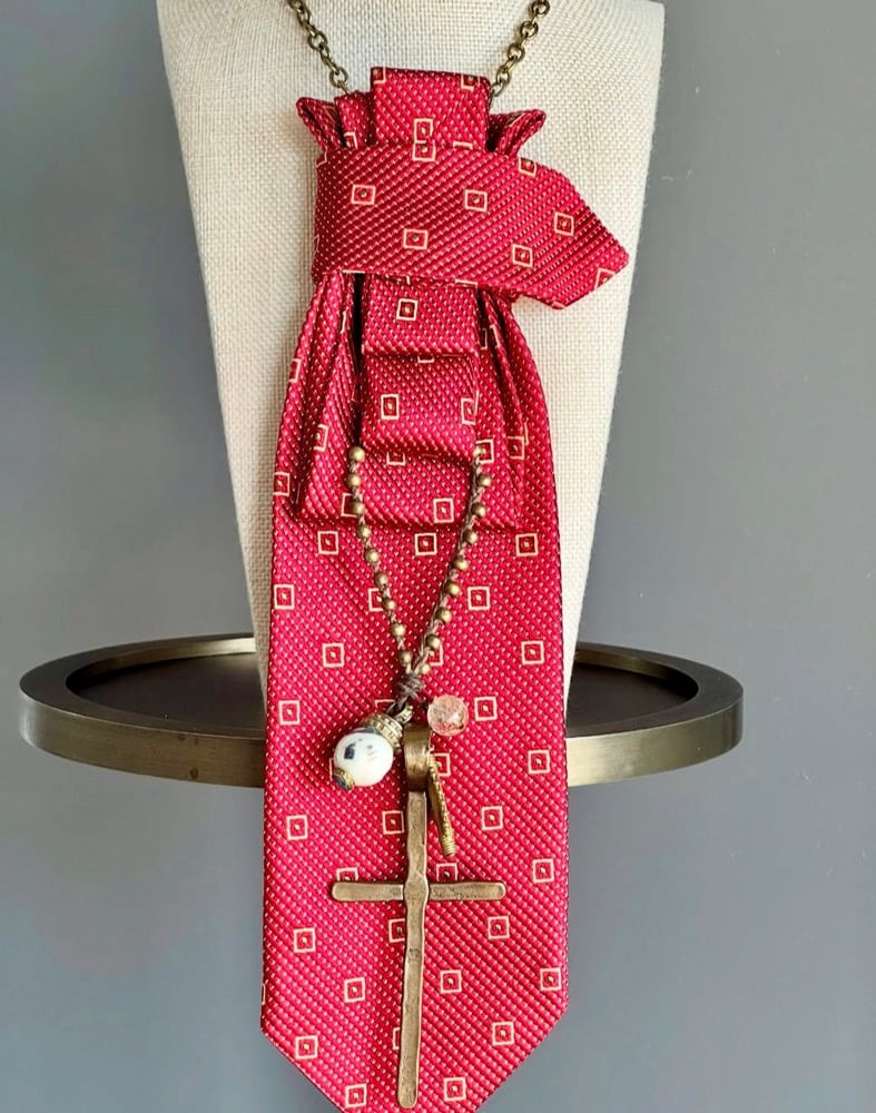 This UpTie is a rich tapestry of faith, history, and artisan flair. Made from a deep red tie adorned with golden diamond motifs, the piece is expertly pleated into a stacked, architectural design that adds depth and elegance. Draped across the center is a rosary-inspired charm necklace featuring a rustic bronze cross, a pearl-like bead, a shimmering gemstone, and a gold shell — symbols evoking pilgrimage, devotion, and beauty. The chain is a warm antique brass, adding an heirloom feel that ties it all together with reverence and grace.