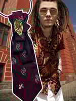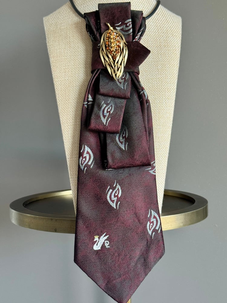 A deep burgundy silk base is emboldened with silvery tribal-style flames and a crowned swan emblem, evoking both elegance and edge. The gold-tone feather brooch with amber rhinestones adds a fiery focal point, like a spark rising from the ashes. It’s a power piece—regal, rich, and unapologetically fierce.