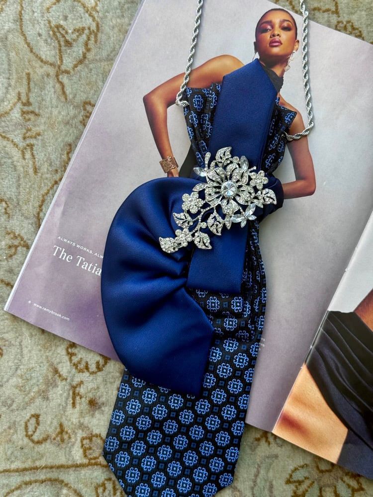 A rich navy silk tie paired with a patterned midnight-blue base, elevated by a dramatic sculpted satin swirl that curves like a ribbon in motion. Anchored at the neckline with an ornate vintage crystal floral brooch, this piece blends structure and softness in the most elegant way.
