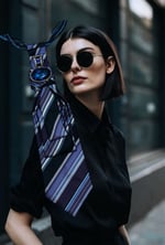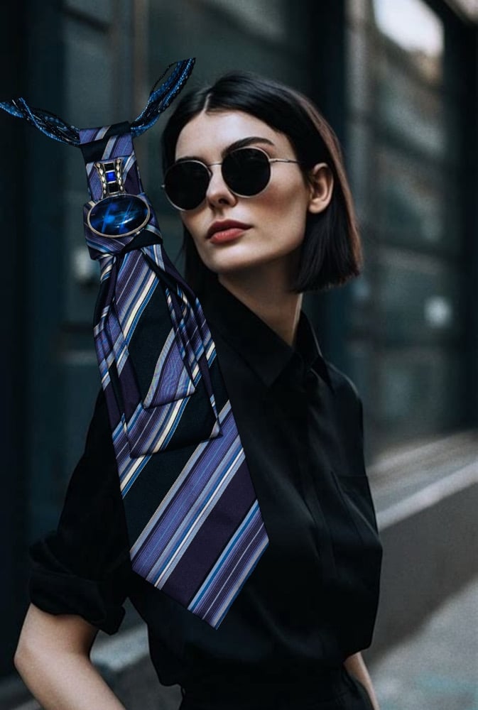 A swirl of inky plum, violet, and stormy silver stripes gives this UpTie an air of polished mystery. Its sleek folds drape like dusk on silk, perfectly framing a dramatic deep blue cabochon brooch, crowned with silver accents and sapphire-like baguette stones. The look is completed with a strand of shimmering navy and indigo seed beads, adding layered texture and moody sparkle. Sophisticated yet bold, this piece whispers power without ever raising its voice.
