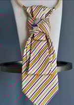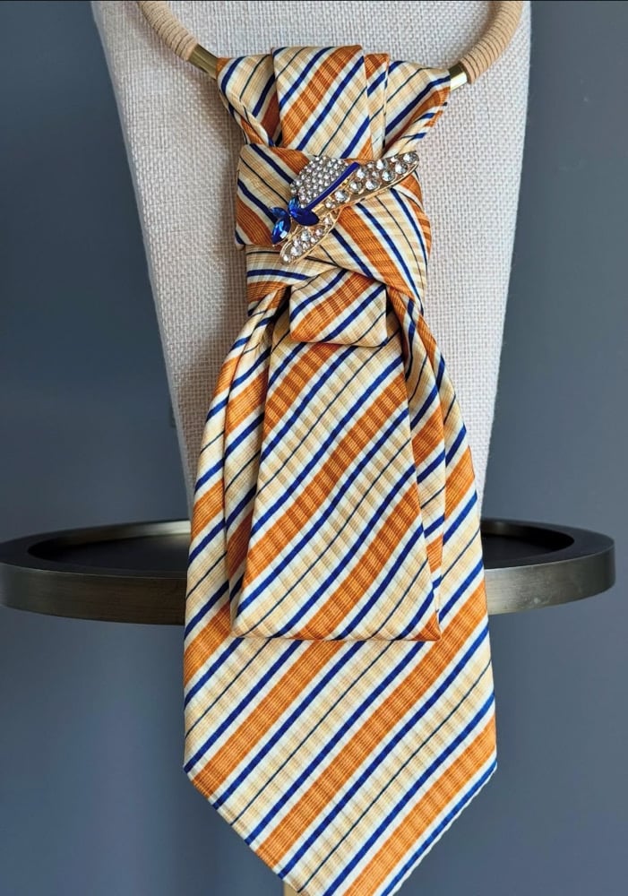 Golden-hour stripes and fluttering whimsy. This hand-stitched UpTie features a warm plaid in soft gold, cream, and navy — evoking sunlit fields and vintage linen. Perched near the knot, a sparkling rhinestone dragonfly brings unexpected glam and movement, while the wrapped choker-style collar adds an earthy finishing touch. This one’s part rustic dream, part garden fairy.