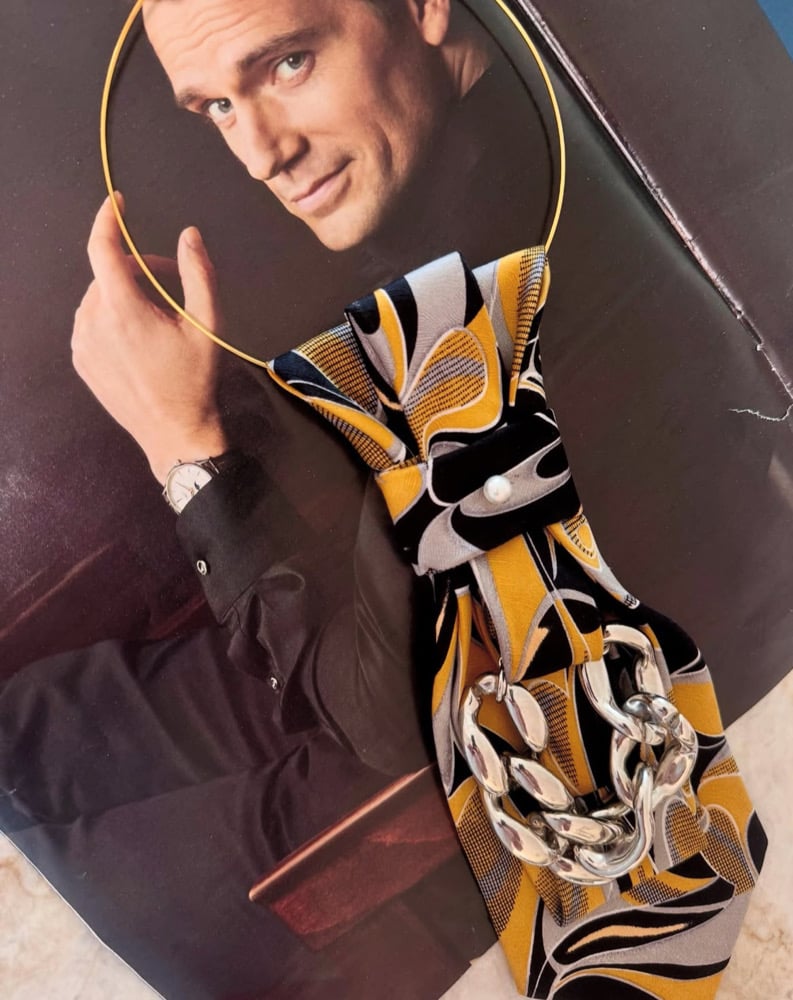 Bold and sculptural, this hand-stitched UpTie brings together high-fashion attitude and industrial edge. With a swirling black, mustard, and silver design, it’s anchored by oversized silver chain links that command attention. A single pearl detail at the neck and a gleaming gold choker-style loop complete the look — unexpected, unapologetic, and unforgettable.