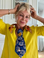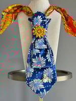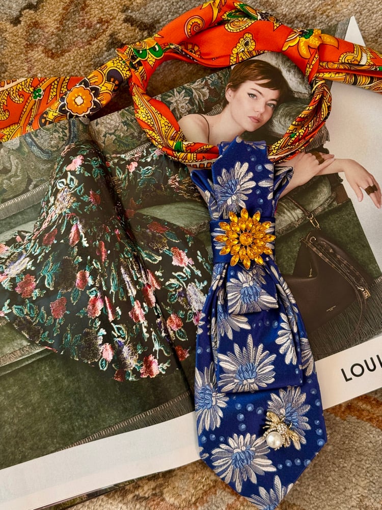 A cobalt blue floral silk UpTie bursts into life with sculpted folds, dotted petals, and a radiant golden crystal bloom at its center. Finished with a whimsical pearl-and-bee accent and an unexpected pop of vibrant orange silk at the neckline, Sunspell Bloom is a one-of-a-kind, hand-crafted statement piece made from vintage men’s ties and reimagined as wearable art.