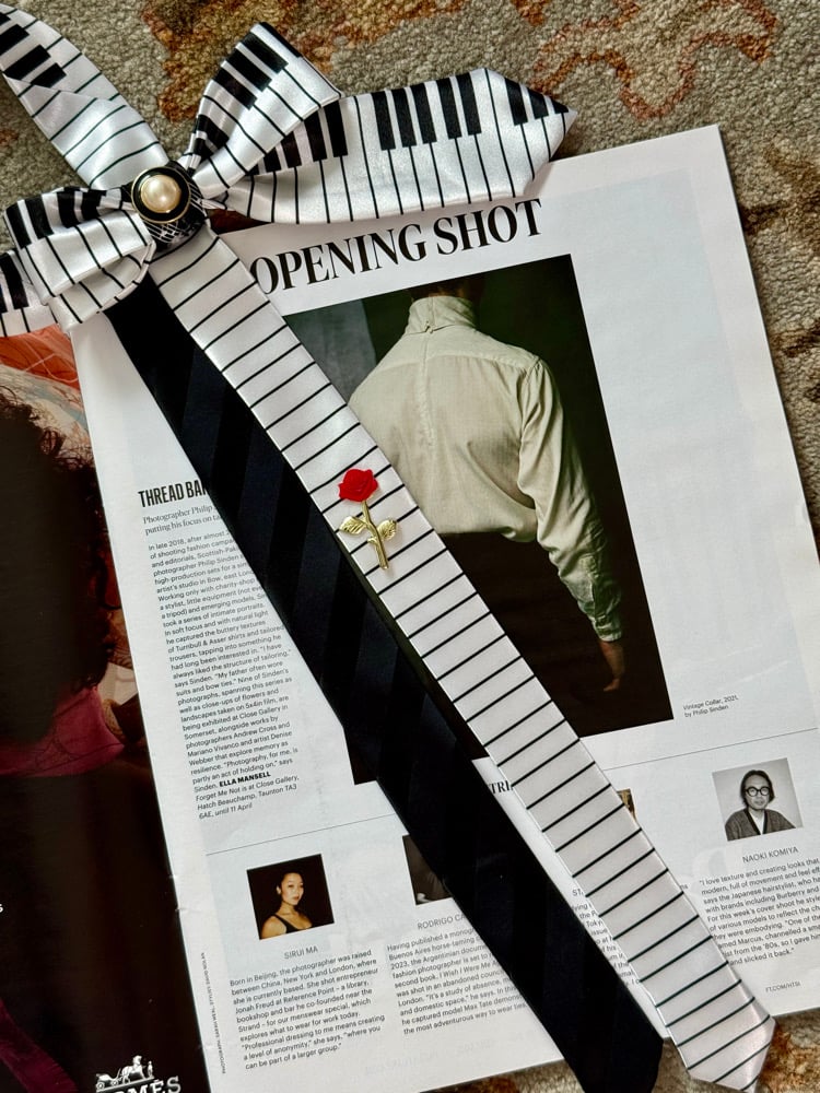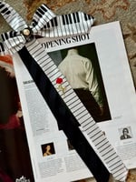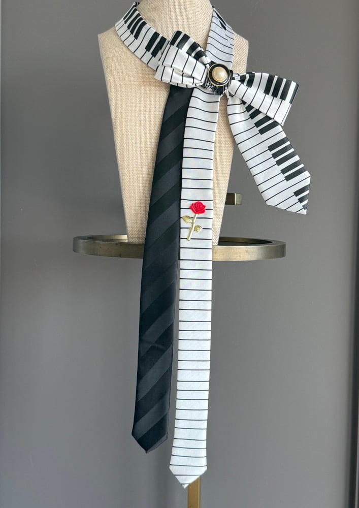 This one-of-a-kind UpTie blends graphic black-and-white piano key patterns with classic pinstripes, creating a striking visual rhythm that feels both modern and timeless. The sculptural bow detail at the neckline adds softness and movement, while a delicate red rose accent brings a subtle pop of romance.
