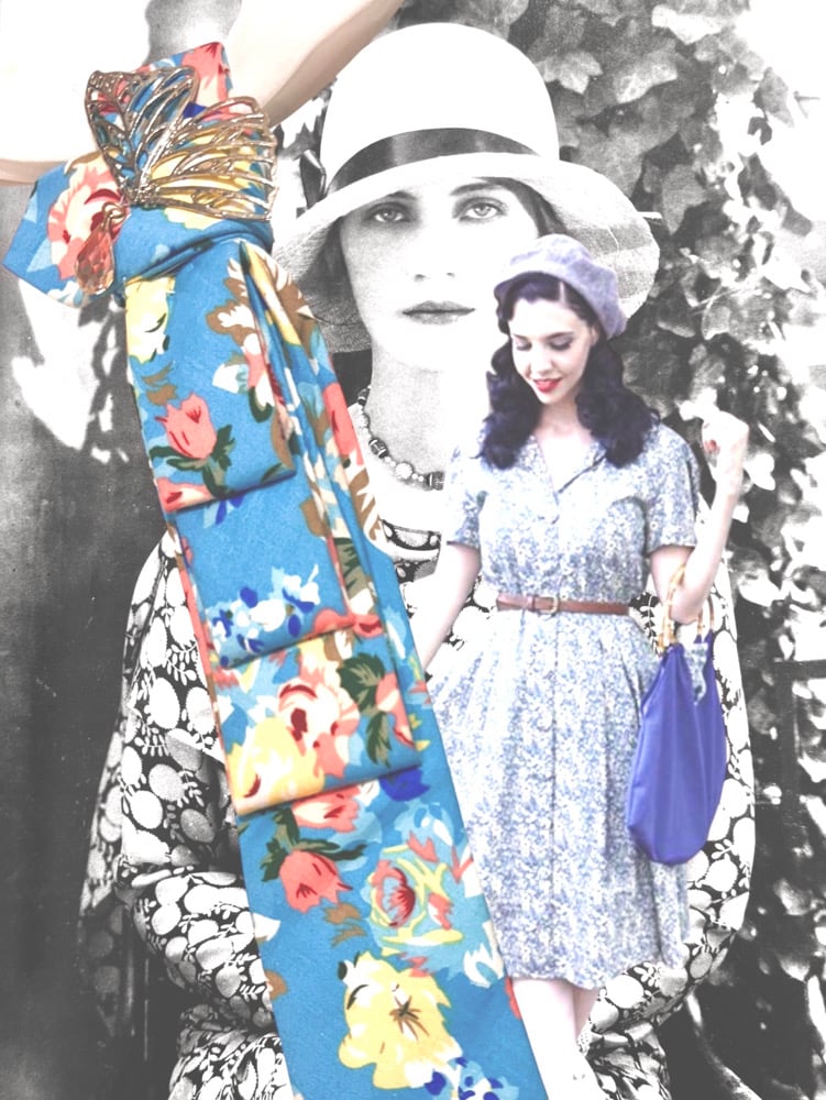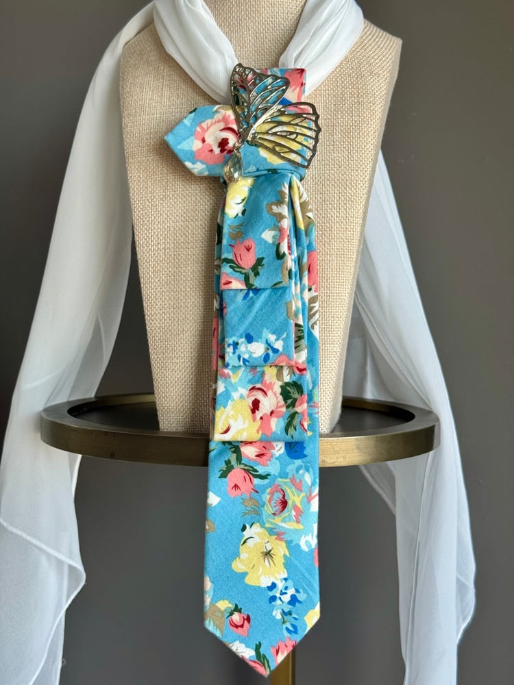 A pastel bouquet on sky-blue cotton, topped with a silvery butterfly wing and sheer chiffon wrap. Soft, romantic, and blooming with charm.