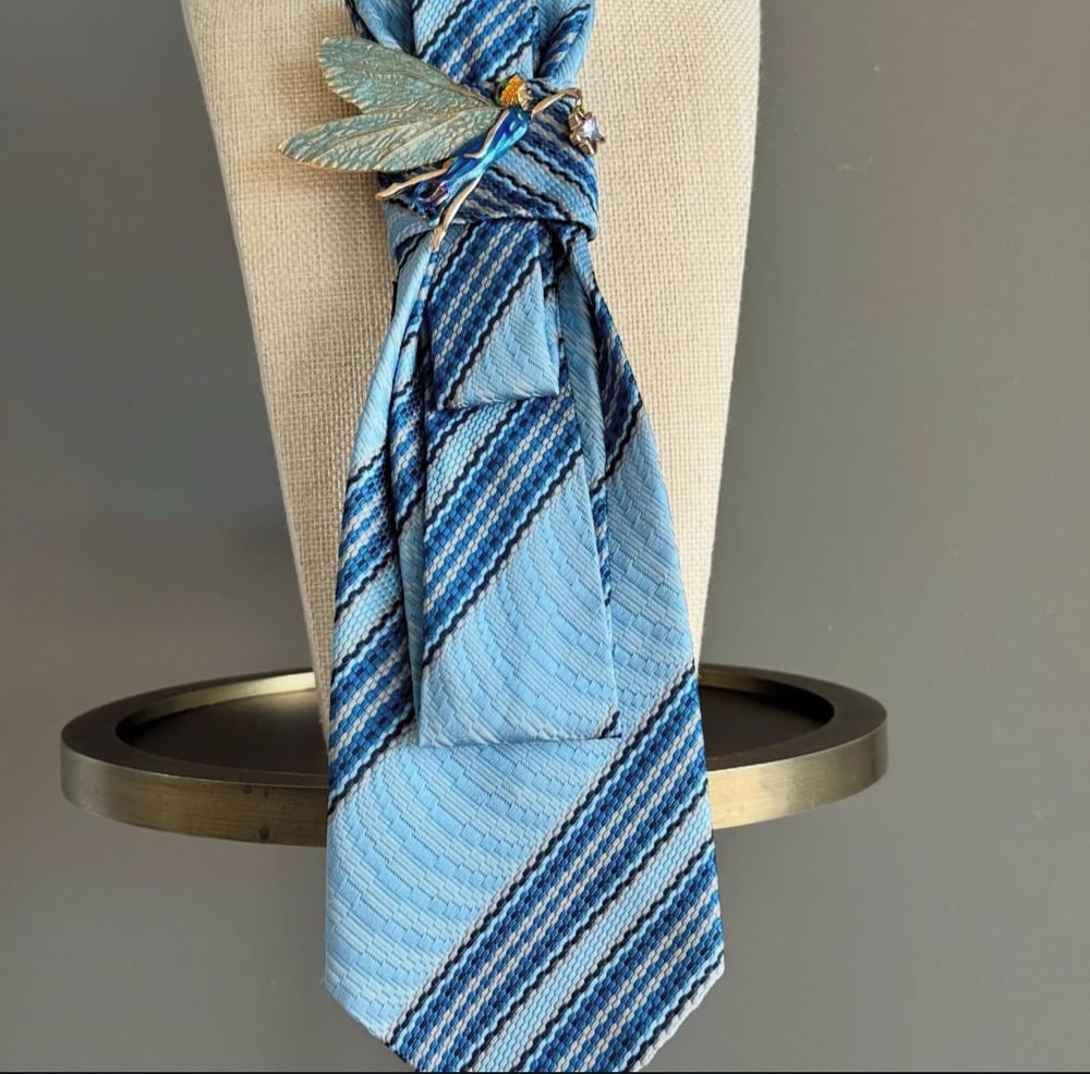 This enchanting sky-blue tie swirls with shimmering navy and silver stripes, like moonlight on water. Front and center, a whimsical fairy charm takes flight—her iridescent wings and wand casting violet star-spells of wonder. With layered pleats and a fluid drape, this tie necklace captures the spirit of fantasy and flight. It’s a wearable daydream for anyone who believes in magic (and impeccable style).