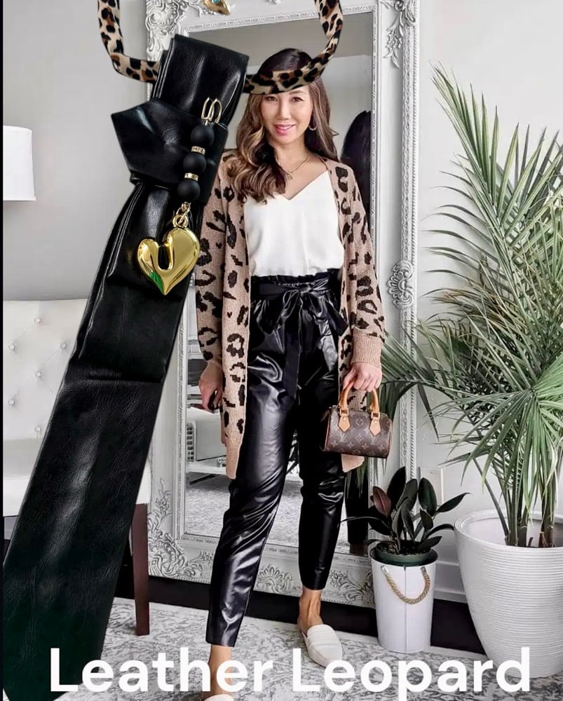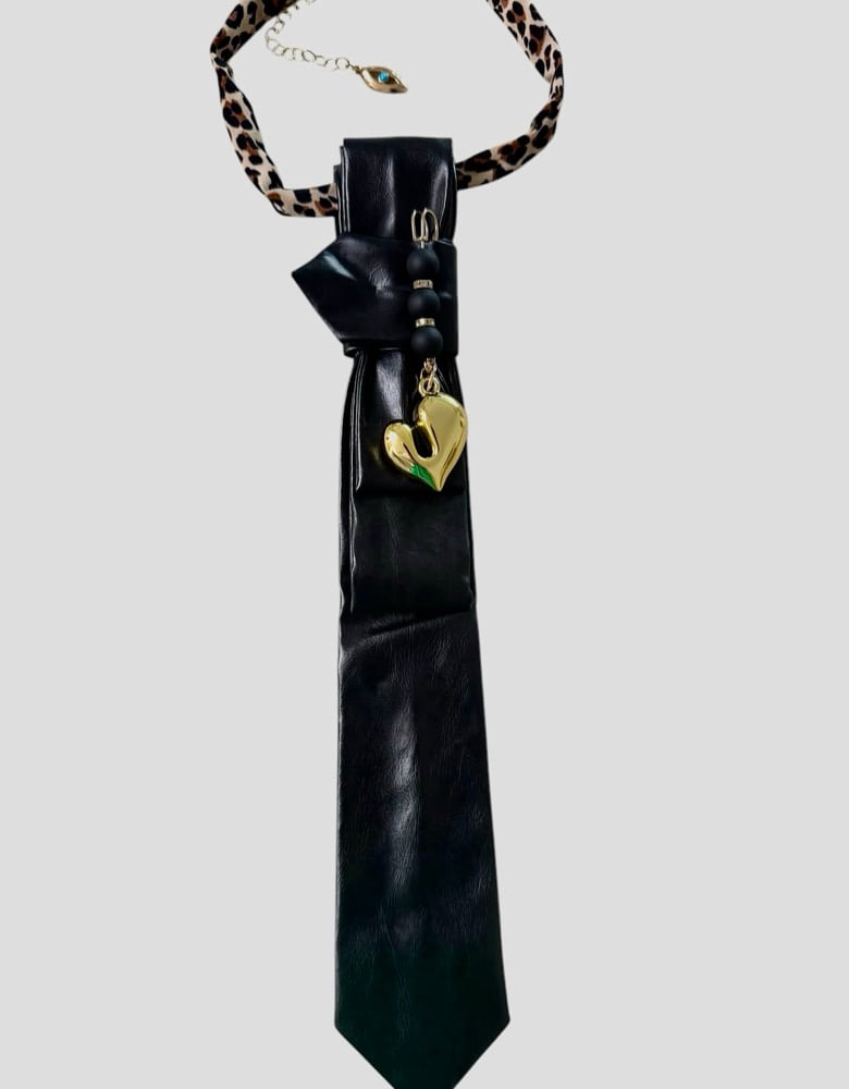 This fierce and fabulous UpTie is where rock ‘n’ roll edge meets luxe leopard glam. Crafted from buttery-soft black leather, the tie is folded into a sleek, elongated silhouette with bold geometric pleating near the neckline. Dangling from the center is a sculptural, high-shine gold heart charm — asymmetrical and full of sass — paired with matte black and gold-accented beads for an extra hit of attitude. The cherry on top? A leopard-print fabric chain that brings just the right amount of wild to this rebel-chic piece.