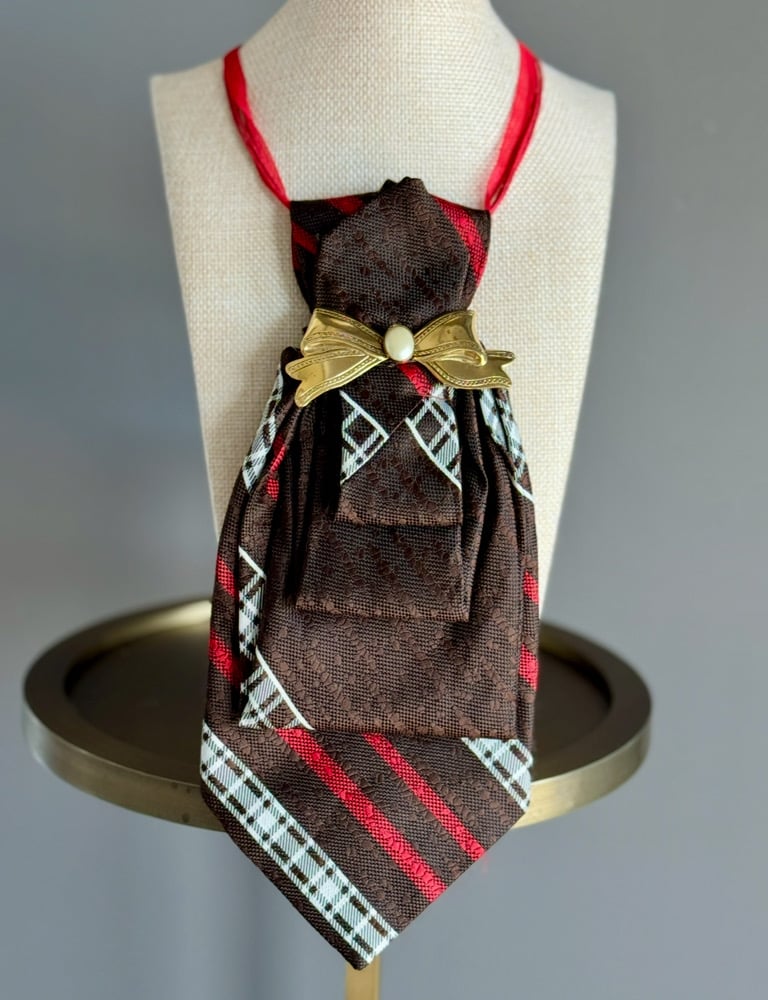 A dapper mix of rugged elegance and vintage grace, this chocolate-brown UpTie features a bold plaid pattern with pops of red and cream. At its center: a golden bow brooch with a creamy pearl detail that adds just the right touch of formality. Suspended on shiny red ribbon cords, this piece feels like a highland holiday meets royal tea time.