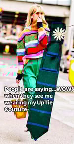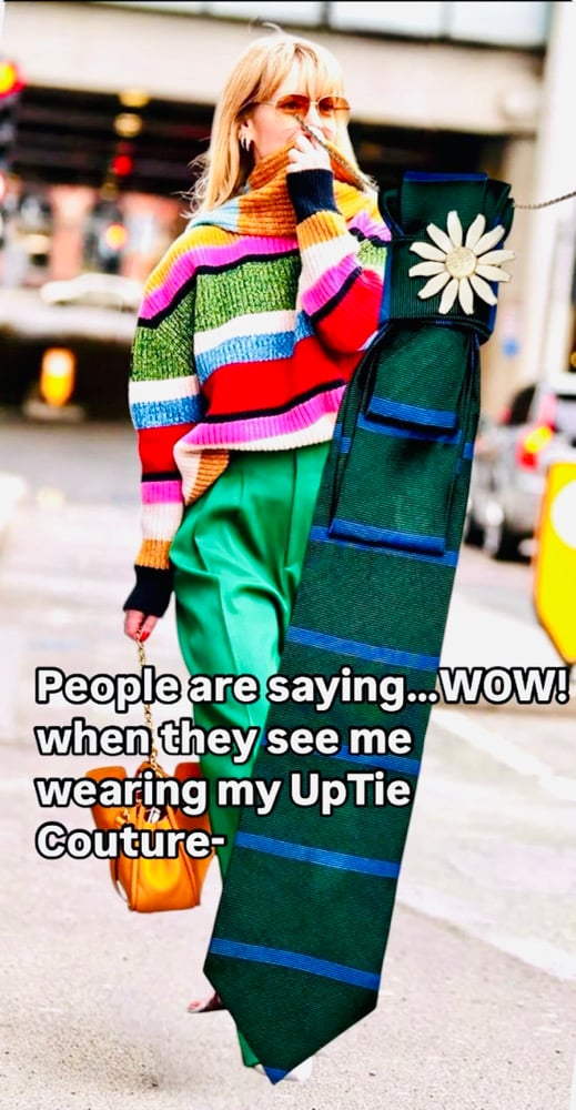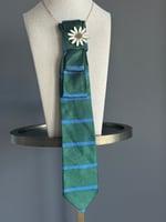 This vibrant tie features a deep forest green backdrop accented with crisp cobalt blue stripes—a classic palette with collegiate cool. But the true showstopper is the oversized daisy perched confidently at the neckline, adding a burst of sunny personality and retro charm. With its bold contrast and tailored shape, this UpTie is a celebration of nature’s whimsy and confident style.